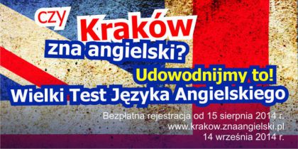 14 wrzenia 2014 mieszkacy Krakowa napisz Wielki Test Jzyka Angielskiego. Jest to oglnopolskie wydarzenie edukacyjne, ktre po raz trzeci odbdzie si jednoczenie w okoo stu miastach Polski. Centrum Jzykw Obcych Nowohuckiego Centrum Kultury postanowio doczy do akcji testowania Polakw jako organizator lokalny - chcemy promowa nauk jzyka angielskiego, umoliwi mieszkacom bezpatne sprawdzenie kompetencji jzyka angielskiego oraz (...)  ... więcej »