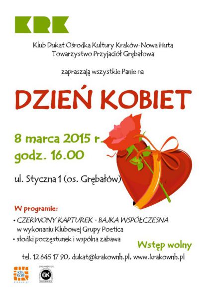 | Klub Dukat Orodka Kultury Krakw-Nowa Huta (ul. Styczna 1) zaprasza wszystkie Kobiety z Grbaowa i okolic do udziau w spotkaniu przygotowanym specjalnie z okazji ich wita w dniu 8 marca o godz. 16.00. W programie Dnia Kobiet w Klubie Dukat znajdzie si m.in. wystp Klubowej Grupy Poetica. Grupa zaprezentuje si w przedstawieniu Czerwony Kapturek - Bajka Wspczesna. W dalszej czci spotkanie serwowany bdzie przez panw poczstunek oraz wsp(...) ... więcej » |