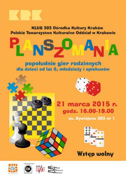 | Mylisz strategicznie? A moe wolisz logik? Jeste szybki? Nie wiesz co zrobi w sobotnie popoudnie? Przyjd 21 marca na godz. 16.00 do Klubu 303 Orodka Kultury Krakw-Nowa Huta (os. Dywizjonu 303 nr 1) na spotkanie nie tylko dla mionikw gier planszowych. W tym dniu bdzie mona sprbowa swoich si w gigantycznej grze karcianej, w grach logicznych czy strategicznych. Nie zabraknie te gier wiczcych refleks i spostrzegawczo. A moe masz(...) ... więcej » |
