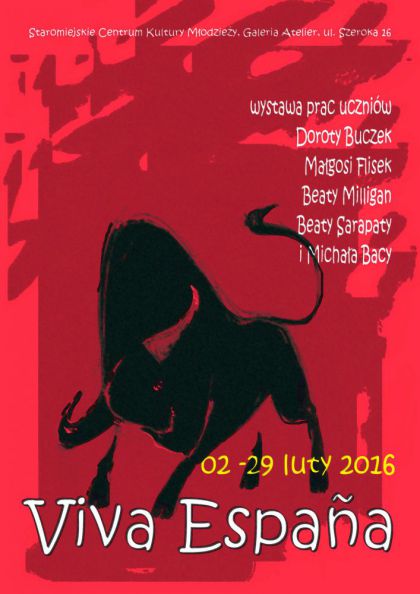 Zapraszamy na wernisa wystawy prezentujcej prace uczestnikw zaj plastycznych prowadzonych pod kierunkiem Beaty Milligan, Doroty Kozowskiej-Buczek, Beaty Sarapaty, Magorzaty Flisek i Michaa Bacy w Staromiejskim Centrum Kultury Modziey w Krakowie. Tematem przewodnim wystawy s inspiracje sztuk Hiszpanii i hiszpaskich artystw takich jak: Diego Velazquez, Francisco Goya, Pablo Picasso, Salvador Dali i inni.
