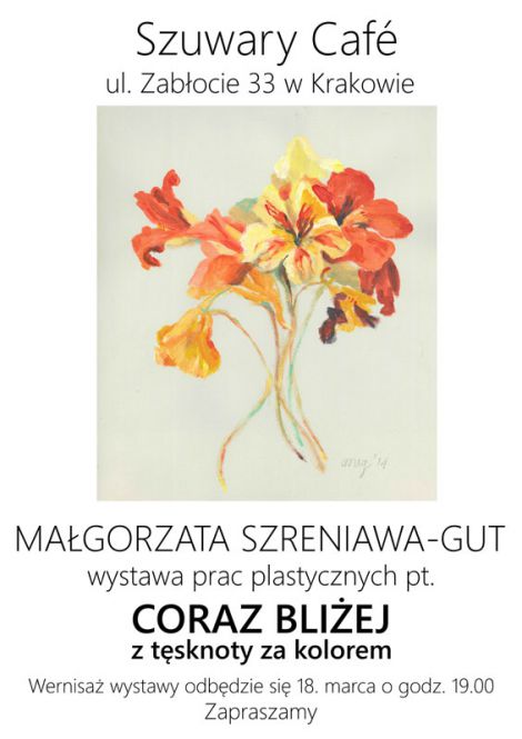 | Szuwary Cafe (ul. Zabocie 33) zaprasza w pitek (18.03) o godz. 19.00 na wernisa wystawy prac plastycznych Magorzaty Szreniawy-Gut Coraz bliej. Z tsknoty za kolorem, wstp wolny,(...) ... więcej » |