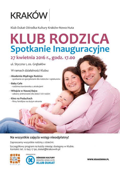 | Serdecznie zapraszamy 27 kwietnia o godz. 17:00 do Klubu Dukat Orodka Kultury Krakw-Nowa Huta na ul. Stycznej 1, na spotkanie inaugurujce dziaalno Klubu Rodzicw, gdzie przedstawiony zostanie program oraz odbd si pierwsze warsztaty. Interaktywne warsztaty rodzinne Jak si bawi z wasnym dzieckiem poprowadzi animator - pani Magdalena Rutkowska-Oliwa. Wszystkie spotkania w ramach Klubu Rodzicw bd bezpatne, a zajcia bd dzieli si n(...) ... więcej » |