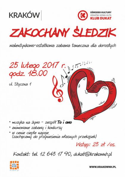 Klub Dukat Orodka Kultury Krakw-Nowa Huta (ul. Styczna 1) zaprasza w sobot 25.02. o godz. 18.00 na walentynkowo-ostatkow zabaw taneczna dla dorosych. Do taca zagra zesp To i owo. Podczas imprezy prowadzone bd animowane zabawy i konkursy, a dla uczestnikw - jak zawsze - przygotowane zostan niespodzianki. Organizatorzy zapewniaj ciepe napoje. Zachcamy do przyniesienia wasnych przeksek.