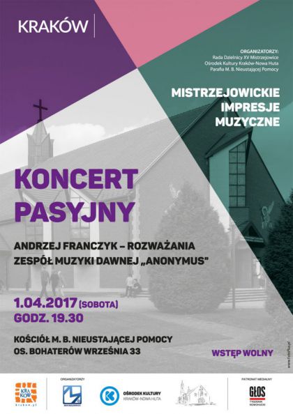 1 kwietnia br. o godz. 19.30 odbdzie si Koncert Pasyjny - pierwszy koncert z nowego cyklu Mistrzejowickie Impresje Muzyczne. Do udziau w nim organizatorzy serdecznie zapraszaj szczeglnie mieszkacw Dzielnicy XV Mistrzejowice, ale take caego Krakowa.