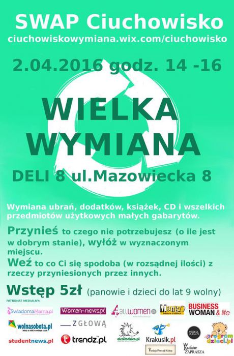 Kolejna edycja szalonej wymiany ubra i dodatkw czyli Krakowskiego Ciuchowiska. Widzimy si w Deli8 ul.Mazowiecka 8. Wymiana odbywa si bdzie na stoach.