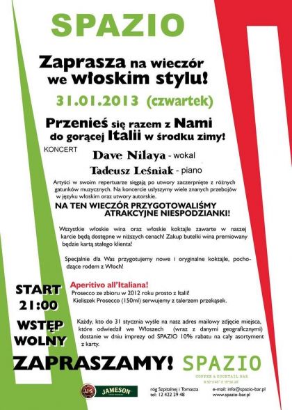 Cafe Spazio zaprasza na wieczr we woskim stylu!