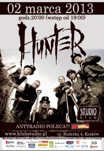 2 marca 2013 roku Klub Studio odwiedzi Hunter - jeden z najbardziej rozpoznawalnych zespow polskiej sceny metalowej. Zaoona w 1985 roku w Szczytnie formacja zdobya uznanie licznych fanw dziki piciu albumom studyjnym i setkach koncertw, zarwno klubowych, jak i podczas wielkich festiwali. Hunter zadebiutowa dziesi lat po swoim powstaniu - w 1995 roku pyt Requiem. XXI wiek przynis kolejne wietne albumy: Medeis, T.E.L.I..., HellWood. Jesieni 2012 roku zesp wyda kolejne wydawnictwo pod tytuem Krlestwo.