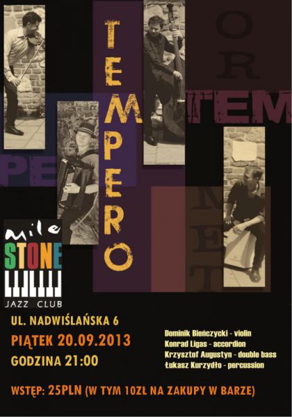 W jzyku hiszpaskim "tempero" oznacza przypraw. Muzyka zespou tworzonego przez czterech krakowskich artystw, wywodzcych si z nurtw jazzu i klasyki, podobnie jak przyprawy, silnie oddziauje na zmysy. Ekspresyjne, jazzowe aranacje muzyki klezmerskiej na skrzypce, akordeon, kontrabas i instrumenty perkusyjne, powoduj u suchaczy niepowtarzalne emocje. Temperamentne dwiki przeplataj si z penymi agodnoci. Nieodczn czci koncertw TEMPERO, s znakomite improwizacje muzykw. Cho kada z nich pena swobody i nonszalancji, wsplnie stanowi niezwykle barwn i precyzyjn mozaik dwikw.