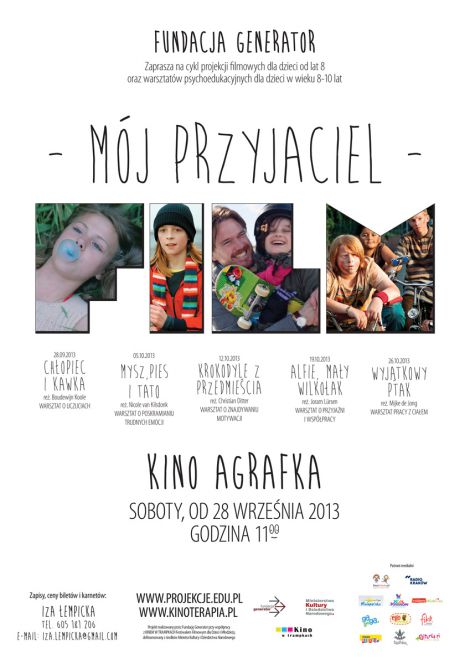 W dniach 28 wrzenia 26 padziernika, w formie cotygodniowych spotka odbd si warsztaty w dziesiciu miastach Polski. W Krakowie, od 28 wrzenia, zapraszamy do kina Agrafka. Kade spotkanie obejmie pokaz specjalnie dobranego filmu fabularnego oraz warsztat psychoedukacyjny. Ma on na celu wspieranie dzieci w rozwoju umiejtnoci spoecznych