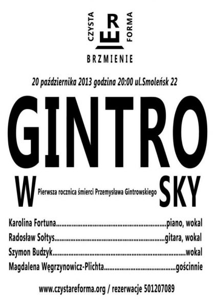Z okazji Pierwszej Rocznicy mierci Przemysawa Gintrowskiego zapraszamy na specjalny koncert, podczas ktrego wybrzmi niezapomniane pieni polskiego barda. Utwory wykonaj dla Was Karolina Fortuna, Szymon Budzyk i Radosaw Sotys - aktorzy, zaoyciele Czystej ReFORMY - Teatru Odwrconego, gocinnie swoje wiersze przeczyta krakowska poetka Magdalena Wgrzynowicz-Plichta. Wszystkich, ktrzy chc sobie przypomnie lub po raz pierwszy odczu na wasnej skrze moc brzmienia lat 80tych zapraszamy bardzo serdecznie.