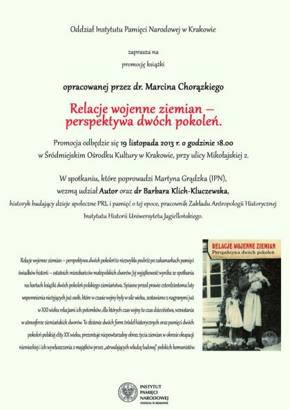 Oddział Instytutu Pamięci Narodowej w Krakowie zaprasza na promocje książki opracowanej przez dr. Marcina Chorązkiego „Relacje wojenne ziemian – perspektywa dwóch pokoleń”.