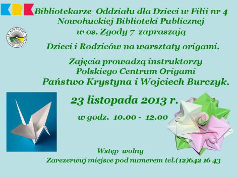 Instruktorzy Polskiego Centrum Origami Pastwo Krystyna i Wojciech Burczyk przeprowadz warsztaty, podczas ktrych naucz uczestnikw spotkania skadania z papieru ciekawych modeli.Origami to sztuka skadania papieru bez nacinania i klejenia, wywodzca si z tradycji chiskiej, jednak w Japonii rozwina si najbardziej. Warsztaty s okazj, aby nauczy si czego nowego. Biblioteka zapewnia papier i materiay potrzebne do zabawy. Zapisy w bibliotece.