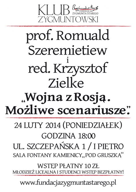 W najbliszy poniedziaek, 24 lutego w Klubie Zygmuntowskim goci bdziemy prof Romualda Szeremietiewa i Krzysztof Zielke. Spotkanie odbdzie si jak zwykle przy ul. Szczepaskiej 1, na I pitrze o godz.18.00 w Sali Baltazara Fontany kamienicy Pod Gruszk.