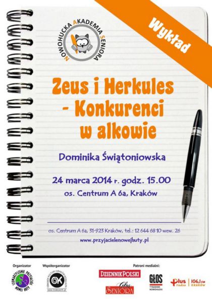 O miłostkach mitologicznego boga Zeusa oraz jego syna Herkulesa w sztuce starożytnej, a także o przemianach jakim uległy te motywy w sztuce i literaturze nowożytnej opowie Dominika Świątoniowska podczas wykładu w Nowohuckiej Akademii Seniora.