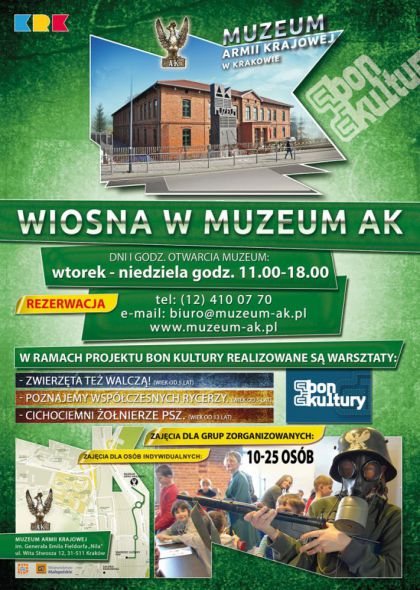 Rezerwacja: kontakt mailowy: rezerwacja@muzeum-ak.pl lub telefoniczny pod nr (12) 4100765 lub (12) 4100770.
