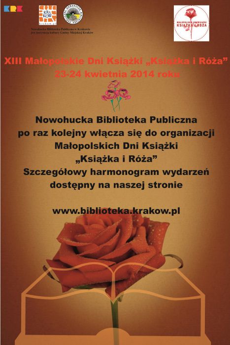 Nowohucka Biblioteka Publiczna w Krakowie wczya si w organizacj tegorocznej edycji Maopolskich Dni Ksiki Ksika i Ra. W dniach 23-24 kwietnia 2014 r. zaplanowano wiele wydarze, ktre bd promoway czytelnictwo, nowoci wydawnicze i autorw ksiek. Bd to m. in.: wystawy, spotkania Dyskusyjnego Klubu Ksiki, przegldy nowoci wydawniczych, zajcia literacko edukacyjne i literacko plastyczne dla dzieci oraz plebiscyt czytelniczy. Ponadto w cyklu: 365 i jeden dzie dookoa ksiki czytelnicy bd mogli wymienia si ksikami. Podczas spotkania pn. Literackie nowoci spod Wawelu Dyrektor Dziau Promocji Wydawnictwa Literackiego zaprezentuje nowoci wydawnicze tej zasuonej oficyny. W cyklu: Akademia rozwoju wyobrani na zajciach pt. Godzina psowej ry prezentowana bdzie szeroka gama botanicznych tytuw ksiek zachcajcych dzieci do czytania na onie natury. Odbdzie si te plebiscyt czytelniczy w dwch kategoriach: dla dorosych pn. Ksika mojego dziecistwa oraz dla dzieci pn. Moja ulubiona ksika. Plebiscyt zakoczy si wystaw ulubionych ksiek wraz z informacj o ich autorach.
