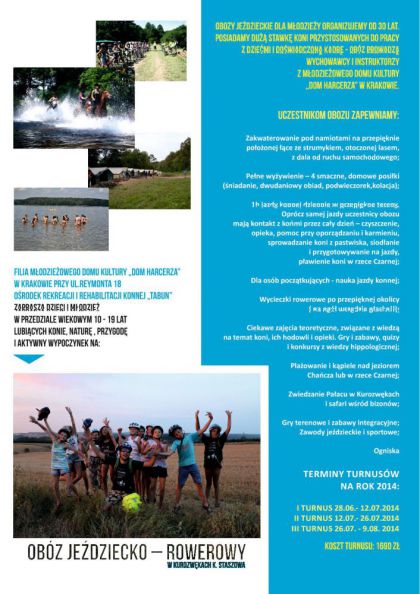 Orodek Rekreacji i Rehabilitacji Konnej Tabun dziaajcy w Modzieowym Domu Kultury Dom Harcerza ju od 28 czerwca zaprasza dzieci i modzie w wieku od 10-19 lat na obz jedziecko rowerowy w Kurozwkach k. Staszowa.