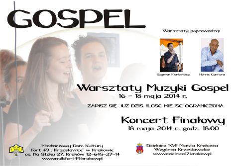 Młodzieżowy Dom Kultury Fort 49 „Krzesławice” w Krakowie zaprasza wszystkich tych dla, których śpiewanie jest radością i chęcią wyrażania siebie na warsztaty Muzyki Gospel, które odbędą się w dniach od 16 do 18 maja 2014 roku. Uczestnicy będą mieli niecodzienną okazję śpiewać pod kierunkiem Szymona Markiewicz oraz Norrisa Garnera. Wydarzenie zakończone zostanie koncertem finałowym na dziedzińcu fortecznym, na który serdecznie zapraszamy w dn. 18 maja 2014 roku.