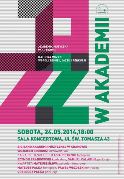 W sobot 24 maja o godz. 18:00 w Sali koncertowej przy ul. w. Tomasza 43 wystpi Big Band Akademii Muzycznej pod kierownictwem Wojciecha Groborza oraz Kasia Pietrzko Trio w skadzie: Kasia Pietrzko - fortepian, Szymon Frankowski kontrabas, Samuel Calabuig perkusjab Grzegorz Paka - perkusja i Kwartet w skadzie: Mateusz liwa - saksofon tenorowy, Mateusz Paka fortepian oraz Pawe Wszoek - kontrabas.