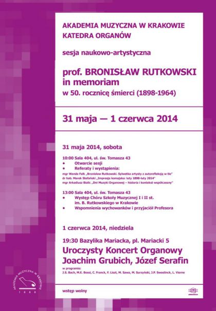31 maja, poczwszy od godziny 10:00 w Sali organowej 404 zostan wygoszone trzy referaty wraz z prezentacj multimedialn, powicone rnym aspektom ycia i dziaalnoci Bronisawa Rutkowskiego, natomiast o godzinie 13:00 pieni autorstwa Profesora zaprezentuje Chr Szkoy Muzycznej I i II st. im. B. Rutkowskiego w Krakowie. Po wystpie bdzie czas na wspomnienia wychowankw i przyjaci Rutkowskiego.