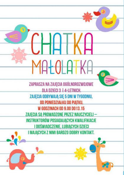 Zapraszamy na zajcia oglnorozwojowe dla dzieci 3- i 4-letnich. Zajcia odbywaj si 5 dni w tygodniu, od poniedziaku do pitku, w godzinach od 9.00 do13.15 i s prowadzone przez nauczycieli instruktorw posiadajcych kwalifikacje, dowiadczenie i majcych bardzo dobry kontakt z dziemi.