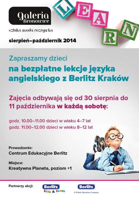 Gry i zabawy językowe z Berlitz Kraków odbywają się w każdą sobotę do 11 października w godzinnych blokach: od godz. 10.00 do 11.00 dla dzieci w wieku 4-7 lat oraz od 11.00 do 12.00 dla dzieci w wieku 8-12 lat, w lokalu „Kreatywna Planeta” - na 1 piętrze Galerii.