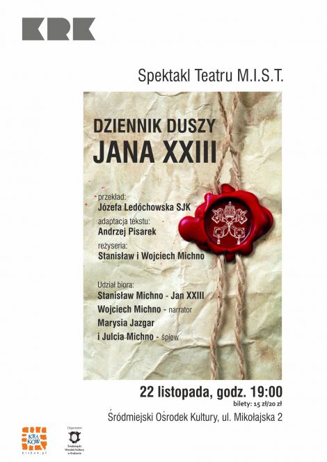 Premiera "Dziennika duszy Jana XXIII" miaa miejsce blisko 40 lat temu w Opactwie Ojcw Cystersw w Nowej Hucie. Byem wwczas modym aktorem Teatru Ludowego, a scenariusz opracowa jako monodram i wyreyserowa mody absolwent dzkiej PWSTiF Andrzej Pisarek. Nie by to wwczas dobry czas na wystawianie "klerykalnych" tekstw. Ale mino kilkanacie lat i czasy raptownie si zmieniy. Papie Jan XXIII zwoa II Sobr Watykaski, ktry zmieni oblicze Kocioa. I znowu troch czasu mino, a nowym papieem zosta nasz rodak Jan Pawe II. Teraz obaj zostali witymi. A my aktorzy chcemy cho odrobin zbliy si do tajemnicy i przedstawi j Pastwu.
