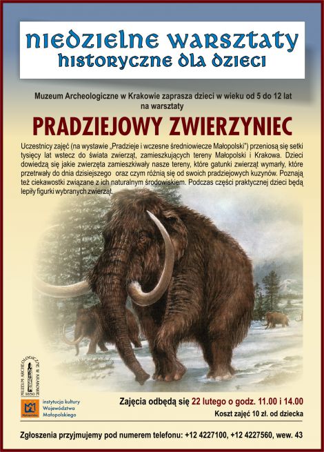 Uczestnicy zajęć (na wystawie „Pradzieje i wczesne średniowiecze Małopolski”) przeniosą się setki tysięcy lat wstecz do świata zwierząt, zamieszkujących tereny Małopolski i Krakowa. Dzieci dowiedzą się jakie zwierzęta zamieszkiwały nasze tereny, które gatunki zwierząt wymarły, które przetrwały do dnia dzisiejszego oraz czym różnią się od swoich pradziejowych kuzynów. Poznają też ciekawostki związane z ich naturalnym środowiskiem. Podczas części praktycznej dzieci będą lepiły figurki wybranych zwierząt.