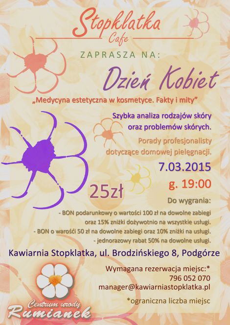 Kawiarnia Stopklatka oraz Centrum urody "Rumianek" zapraszają przeddzień Święta Kobiet wszystkie Panie na wyjątkowe warsztaty pt. "Medycyna estetyczna w kosmetyce. Fakty i mity"