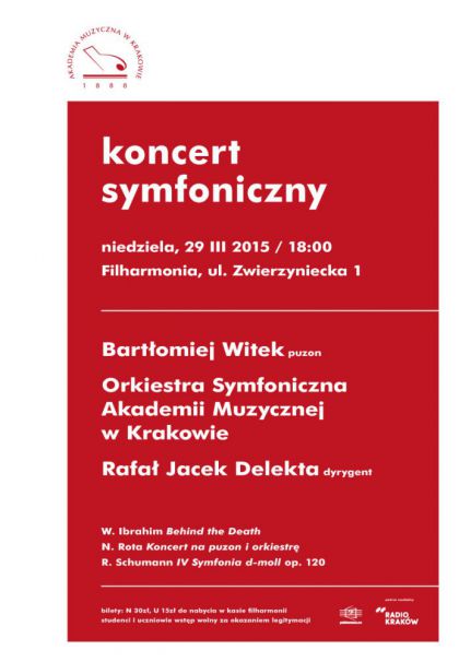 Akademia Muzyczna w Krakowie zaprasza na koncert Orkiestry Symfonicznej, który odbędzie się w niedzielę 29 marca o godzinie 18:00 w Filharmonii im. K. Szymanowskiego w Krakowie. Solistą koncertu będzie młody puzonista, Bartłomiej Witek. W programie znajdą się utwory Nino Roty, Roberta Schumanna oraz Wassima Ibrahima. Całość poprowadzi Rafał Jacek Delekta.