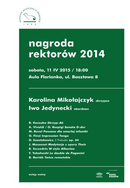 W sobot 11 kwietnia o godzinie 18:00 w Auli Florianka (ul. Basztowa 8) odbdzie si koncert duetu skrzypcowo-akordeonowego Karoliny Mikoajczyk i Iwo Jedyneckiego studentw Uniwersytetu Muzycznego Fryderyka Chopina w Warszawie, ktrzy w listopadzie 2014r. otrzymali nagrod Rektorw Polskich Uczelni Muzycznych oraz Nagrod Stowarzyszenia Autorw ZAiKS. W ramach tej nagrody modzi muzycy wystpuj w Salach Koncertowych wszystkich Uczelni Muzycznych w Polsce. Na repertuar zespou skadaj si utwory, z ktrych wiele to kompozycje oryginalne na skrzypce i akordeon powstae w XX i XI wieku. Muzycy chtnie sigaj te do dzie z rnych epok przeznaczonych na skrzypce i fortepian. Transkrypcje akordeonowe partii fortepianu dokonane przez Iwa Jedyneckiego sprawiaj, e znane utwory zyskuj nowe, ciekawe brzmienie.