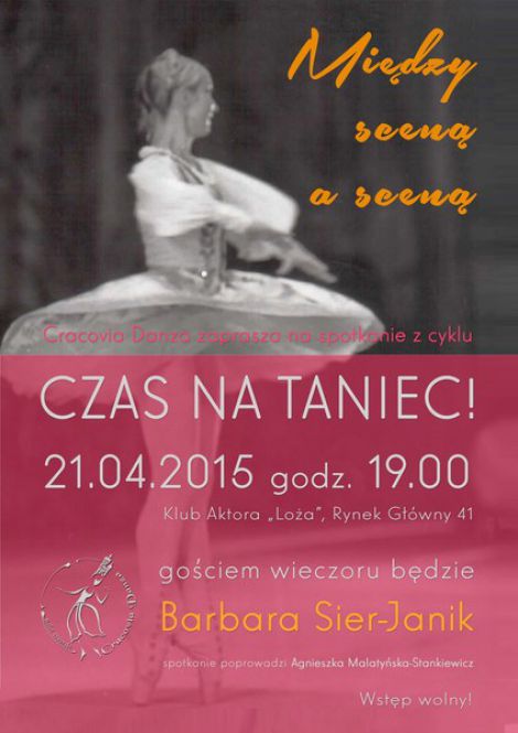Barbara SIER-JANIK - tancerka i pedagog, przez wiele lat pierwsza solistka Baletu Teatru Wielkiego w Warszawie, wieloletnia nauczycielka taca w warszawskiej Pastwowej Szkole Baletowej, wykadowca taca klasycznego i nowoczesnego w Akademii Muzycznej w Warszawie, a od 2007 roku wykadowca taca klasycznego na Wydziale Teatru Taca PWST w Krakowie, oddzia w Bytomiu bdzie gociem kolejnego spotkania z przygotowywanego przez Balet Dworski Cracovia Danza cyklu CZAS NA TANIEC!. Spotkanie zatytuowane Midzy scen a scen odbdzie si we wtorek, 21 kwietnia, o godz. 19, w Klubie Aktora Loa. Krakw, Rynek Gwny 41.