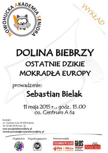 Zapraszamy 11 maja o godz. 15.00 na kolejny wykad dla Nowohuckiej Akademii Seniora (os. Centrum A 6a), ktry wygosi Sebastian Bielak absolwent Akademii Grniczo-Hutniczej oraz Politechniki Krakowskiej, pracownik naukowodydaktyczny Instytutu Inynierii i Gospodarki Wodnej PK, z zamiowania przyrodnik i podrnik. Suchacze bd mieli moliwo zobaczy fotografie i usysze opowieci z jego podry po Dolinie Biebrzy.