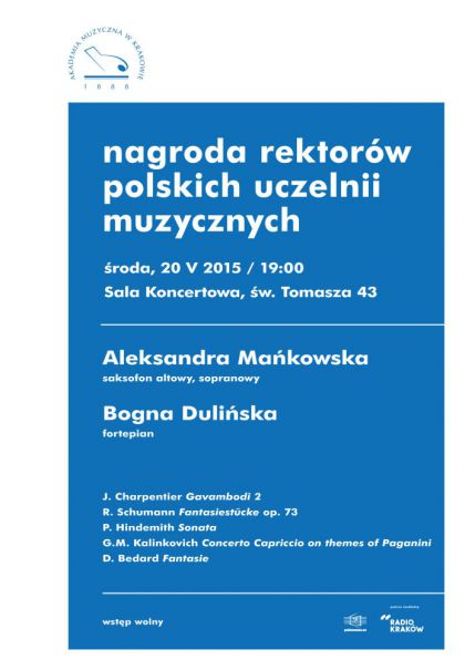 W rod 20 maja o godzinie 19:00 we wntrzu Sali koncertowej przy ul. w. Tomasza 43 zabrzmi muzyka saksofonowa. Wystpi duet z Akademii Muzycznej im. G.K. Bacewiczw w odzi: Aleksandra Makowska, grajca na saksofonie altowym i sopranowym oraz Bogna Duliska, towarzyszca na fortepianie. Zabrzmi kompozycje m.in. J. Charpentiera, R. Schumanna oraz P. Hindemitha. Wstp na koncert wolny.