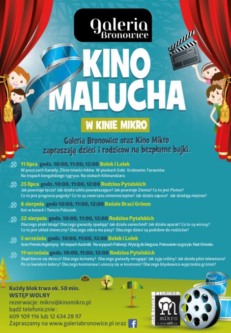 Bajki Rodzina Pytalskich emitowane bd trzykrotnie w sobot 11 lipca w godzinach 10.00-10.50, 11.00-11.50 oraz 12.00-12.50 w Kinie Mikro na 1 pitrze Galerii. Wejcie na seans jest bezpatne, naley jednak dokona wczeniejszej rezerwacji mailem: mikro@kinomikro.pl bd telefonicznie: 609 109 116 lub 12 634 28 97.