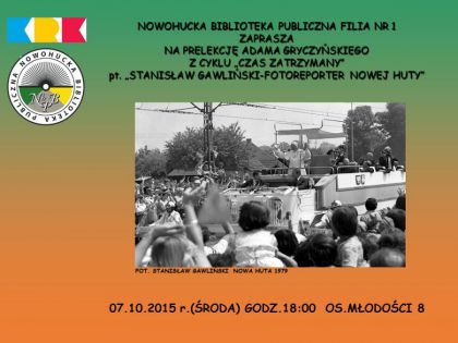 Biblioteka zaprasza na prelekcję Adama Gryczyńskiego z cyklu „Czas zatrzymany” - „Stanisław Gawliński fotoreporter Nowej Huty”. Spotkanie z historią Nowej Huty, podczas którego zostaną zaprezentowane zdjęcia z archiwum Stanisława Gawlińskiego, nestora fotoreporterów prasowych. Stanisław Gawliński od roku 1959 związany był z „Głosem Nowej Huty”, dokumentował budowę kombinatu metalurgicznego i najważniejsze nowohuckie wydarzenia, aż do czasów współczesnych. W spotkaniu będzie uczestniczył autor zdjęć.