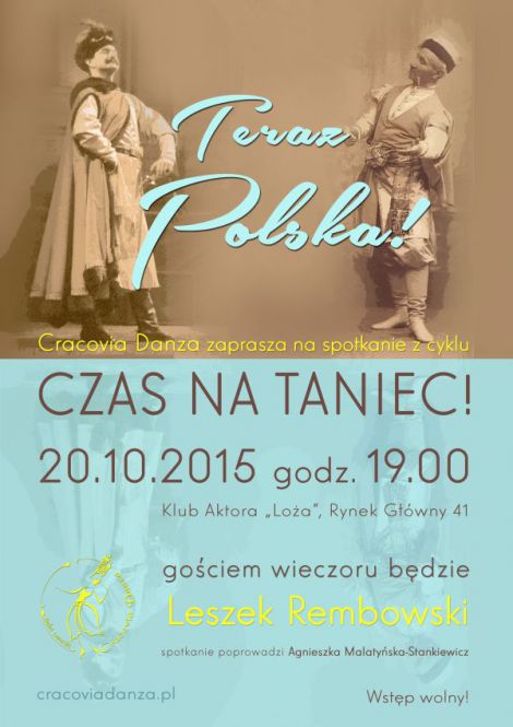 Mazur, kujawiak, oberek, krakowiak, polonez bd bohaterami najbliszego spotkania z cyklu Czas na taniec! organizowanego przez Balet Dworski Cracovia Danza. Do rozmowy o tacach polskich organizatorzy zaprosili Leszka Rembowskiego, wybitnego ich znawc, choreografa, wykadowc Oglnoksztaccej Szkoy Baletowej w Poznaniu, ktrego warsztaty tacw polskich podczas Festiwalu Tacw Dworskich Cracovia Danza co roku przycigaj dziesitki osb. Spotkanie odbdzie si w Klubie Aktora Loa w Krakowie, we wtorek 20 padziernika o godz. 19.