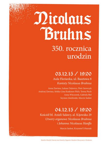 W biecym roku przypada nie tylko 350. rocznica urodzin Jana Sebastiana Bacha, lecz take innego, mniej znanego twrcy czasu baroku, wirtuoza organw i skrzypiec, ktrego twrczo i dziaalno instrumentalna pozostaje jakby nieco w cieniu nazwiska lipskiego kantora. Artyst tym by Nicolas Bruhns. Jego twrczo , cho mniej obfita od Bacha, jest rwnie interesujca i reprezentatywna dla muzyki niemieckiego baroku. Panoram twrczoci oratoryjnej Bruhnsa bdzie mona wysucha w Auli Akademii Muzycznej Florianka, podczas koncertu, na ktry zapraszamy w czwartek 3 grudnia na godzin 19.00. Artyci piewacy oraz solici instrumentalici specjalizujcy si w wykonawstwie muzyki dawnej, zwizani z Katedr Muzyki Dawnej Akademii Muzycznej w Krakowie przedstawi cykl kantat Nicolasa Bruhnsa. Dla wszystkich sympatykw muzyki dawnej bdzie to okazja do porwnania, w jaki sposb twrczo kantatowa tego kompozytora rni si od osigni Jana Sebastiana Bacha, uznawanego za niedocignionego mistrza w tej dziedzinie muzyki. Wstp na koncert jest wolny!