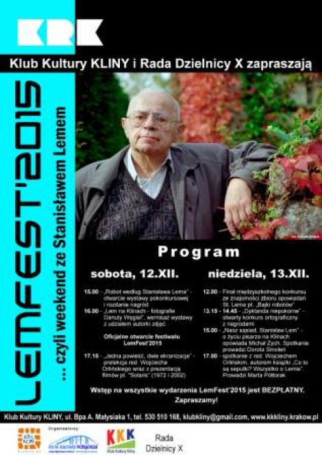 Kliny KlinyAha, to tam, gdzie mieszka Lem! - ile razy syszelimy w przeszoci takie zawoanie. Na Klinach mieszka i mieszkao wiele wybitnych osobistoci. Uczeni, artyci, znakomici specjalici z rnych dziedzin Jednak bodaj najsawniejszym z nich by wanie Stanisaw Lem. Chcemy przypomnie i przybliy posta naszego wielkiego Ssiada - pisarza, filozofa, wizjonera, organizujc w dniach 12-13 grudnia 2015 r. w Klubie Kultury Kliny LemFest2015, czyli weekend ze Stanisawem Lemem. Doczamy szczegowy program tego wydarzenia.