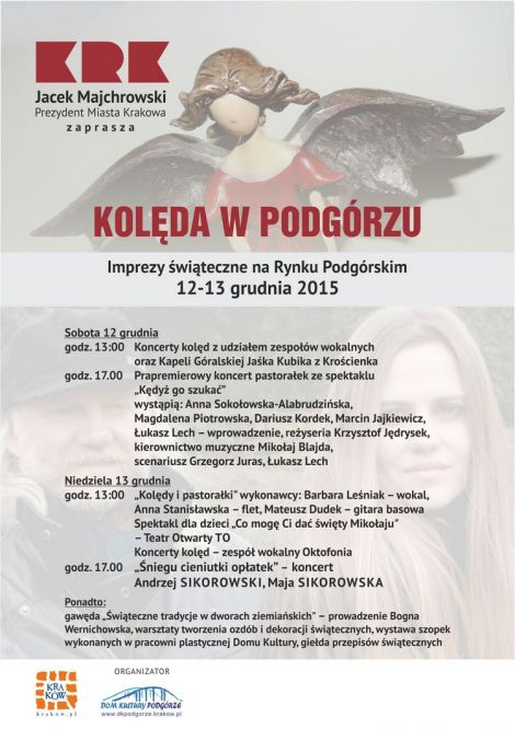 Kolda w Podgrzu odbdzie si w sobot i niedziel, 12 i 13 grudnia, na Rynku Podgrskim. W programie imprezy zaplanowano m.in. wystpy zespow tanecznych z dworu Czeczw, gied przepisw witecznych, warsztaty tworzenia stroikw i ozdb witecznych, wystaw szopek wykonanych przez dzieci. Odbdzie si rwnie konkurs na dekoracj stou witecznego. Koldy i pastoraki zapiewaj uczestnicy eliminacji do Midzynarodowego Festiwalu Kold i Pastoraek im. ks. Szwarlika w Bdzinie.