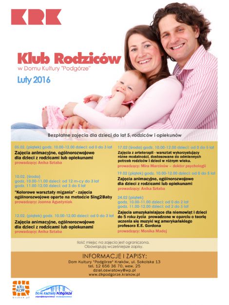 Od lutego zostaje uruchomiony w naszej placwce Klub Rodzicw - bezpatne zajcia dla dzieci do lat 3, rodzicw i opiekunw. W ofercie m.in Akademia Modej Mamy, zajcia umuzykalniajce, kurs pierwszej pomocy przedmedycznej, warsztaty dla kobiet w ciy i ich partnerw oraz zajcia animacyjne, ruchowe, arteterapii i inne.