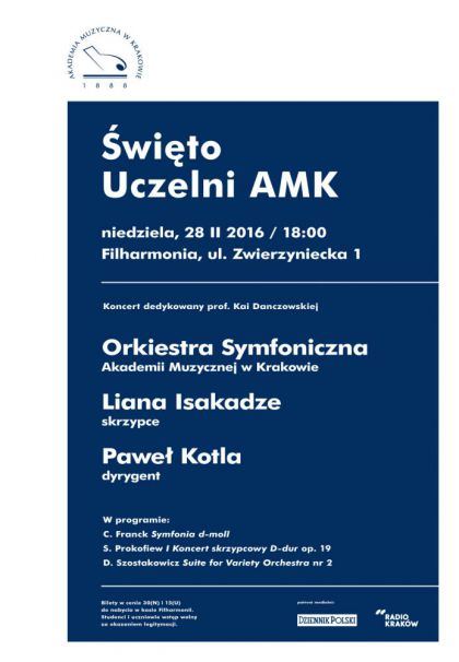 Orkiestrę Symfoniczna Akademii Muzycznej, w której oprócz studentów zasiądą również profesorowie uczelni, poprowadzi znakomity dyrygent Paweł Kotla. Solistką koncertu będzie skrzypaczka, Liana Isakadze. W programie znajdzie się wielka symfonika europejska w postaci dzieł Cesara Francka, Sergiusza Prokofiewa i Dymitra Szostakowicza. Będzie to niewątpliwie Muzyczne święto Krakowa, zważywszy na okoliczności koncertu, jego program oraz całą plejadę wybitnych krakowskich instrumentalistów, którzy wraz z muzyczna młodzieżą zasiądą przy orkiestrowych pulpitach.
