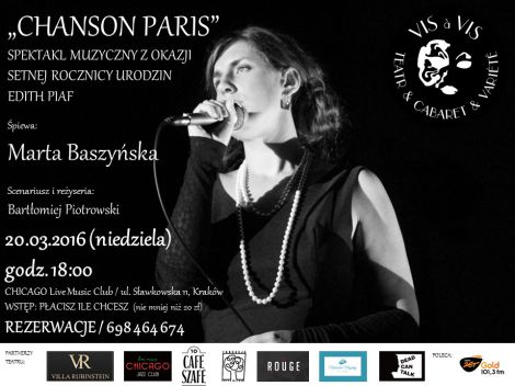 W wyjtkowym programie CHANSON PARIS - najpikniejsze piosenki Edith Piaf, francuskie szlagiery oraz przeboje Ewy Demarczyk, a take wiersze Jacquesa Preverta i Haliny Powiatowskiej - zapiewa Gwiazda scen muzycznych, artystka Teatru VIS a VIS - Marta Baszyska.