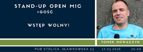 Tomek Nowaczyk obiecujcy (na przykad zwrot poyczonych pienidzy) stand-upper. Zwycizca konkursu One Ryj Show podczas XIX Rybnickiej Jesieni Kabaretowej 2014. Czonek kabaretu Czesuaf, naogowy biegacz (kilkanacie ukoczonych maratonw i yje!), autor wierszy dla dzieci. Jako stand-upper tworzy raczej nie dla dzieci. Ma wielu fanw, z tym e nie wszyscy ju o tym wiedz. Wystpowa na wielu Stolica zaprasza na imprez typu stand-up! W pierwszej czci odbdzie si open mic. Kady, kto ma ochot, wchodzi na scen, aby opowiedzie kawaek stand-upu, histori z ycia, anegdot, bardzo dziwny, zabawny sen (ale jednak nalepiej kawaek stand-upu).