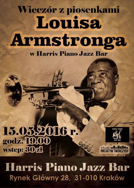 Serdecznie zapraszamy na wyjtkowy wieczr z piosenkami Louisa Armstronga w dniu 15.05.2016 r., o godz. 19.00 w Klubie Harris Piano Jazz Bar w Krakowie, Rynek Gowny 28.