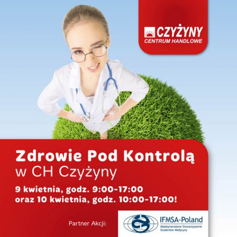 W sobotę 9 kwietnia w godzinach 9:00 - 17:00 oraz w niedzielę 10 kwietnia w godzinach od 10.00 do 17.00 w ramach akcji "Zdrowie Pod Kontrolą", przygotowanej we współpracy z krakowskim oddziałem Międzynarodowego Stowarzyszenia Studentów Medycyny IFMSA-Poland, można będzie za darmo wykonać następujące badania:
