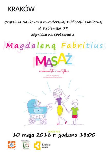 10 maja o godzinie 18:00 Czytelnia naukowa Biblioteki Gwnej przy ul. Krlewskiej 59 zaprasza na spotkanie autorskie z Magdalen Fabritius, autork ksiki: "Masa Niemowlt krok po kroku, czyli jak si cieszy rodzicielstwem dzie po dniu". Bdzie nam bardzo mio, jak przyjdziecie. Moecie zaprosi swoich znajomych. Masa nie ogranicza si tylko do niemowlt. Masowa mona rwnie dzieci starsze i nastolatki. Im wicej osb dowie si o tym, tym wicej dzieci skorzysta z zalet czuego bliskiego kontaktu z rodzicami.