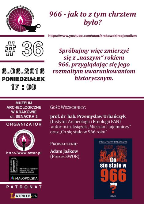 Spotkanie z prof. dr hab. Przemysławem Urbańczykiem (Instytut Archeologii i Etnologii PAN) autorem m.in. książek "Mieszko I tajemniczy" oraz "Co się stało w 966 roku" poprowadzi Adam Jaśkow prezes Stowarzyszenia Wszechnicy Oświeceniowo Racjonalistycznej.