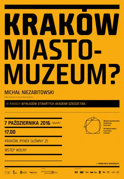 W pitek, 7 padziernika 2016 r. Micha Niezabitowski, dyrektor Muzeum Historycznego Miasta Krakowa wykadem zatytuowanym Krakw. Miasto-muzeum? zainauguruje 11. edycj studiw podyplomowych Akademia Dziedzictwa.