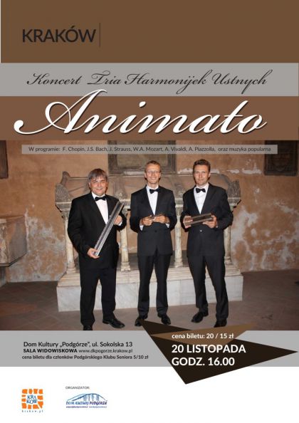 Zesp "Animato" zosta zaoony w 1978 roku w Szczecinie. Jest zespoem unikatowym wykonujcym rnorodn muzyk na koncertowych harmonijkach ustnych. Animato posiada w repertuarze wasne aranacje rnego rodzaju muzyki w tym popularne utwory muzyki klasycznej, standardy jazzowe i swingowe, polskie i wiatowe przeboje muzyki rozrywkowej a take muzyk morsk i ludow z rnych stron wiata. Zesp wykonuje z powodzeniem nie tylko transkrypcje dzie dawnych mistrzw takich jak F. Chopin, J.S. Bach, J. Strauss, W.A. Mozart, A. Vivaldi, ale rwnie utwory wspczesne w tym kompozycje A. Piazzolli, Cz. Niemena, J. Lennona, P. Anki czy utwory z repertuaru takich grup jak Abba, The Beatles i inne.Oprcz nagrd i wyrnie zdobywanych na oglnopolskich festiwalach Animato dwukrotnie stawa na podium midzynarodowych konkursw gry na harmonijce ustnej, m.in. zwyciajc na prestiowym World Harmonica Festival w Trossingen (Niemcy). Zesp zapraszany jest na gocinne wystpy odbywajce si podczas rnych festiwali muzycznych w Polsce i zagranic a jego czonkowie zasiadaj w jury oglnopolskich i midzynarodowych konkursw gry na harmonijce ustnej. W cigu wieloletniej dziaalnoci grupa wystpowaa w renomowanych filharmoniach i salach koncertowych w Polsce i za granic prezentujc szerokie moliwoci techniczne i walory orkiestrowego brzmienia koncertowych harmonijek ustnych.